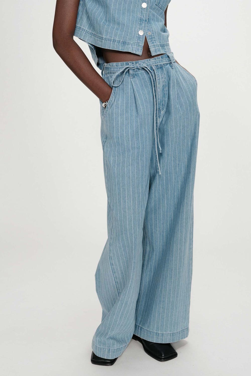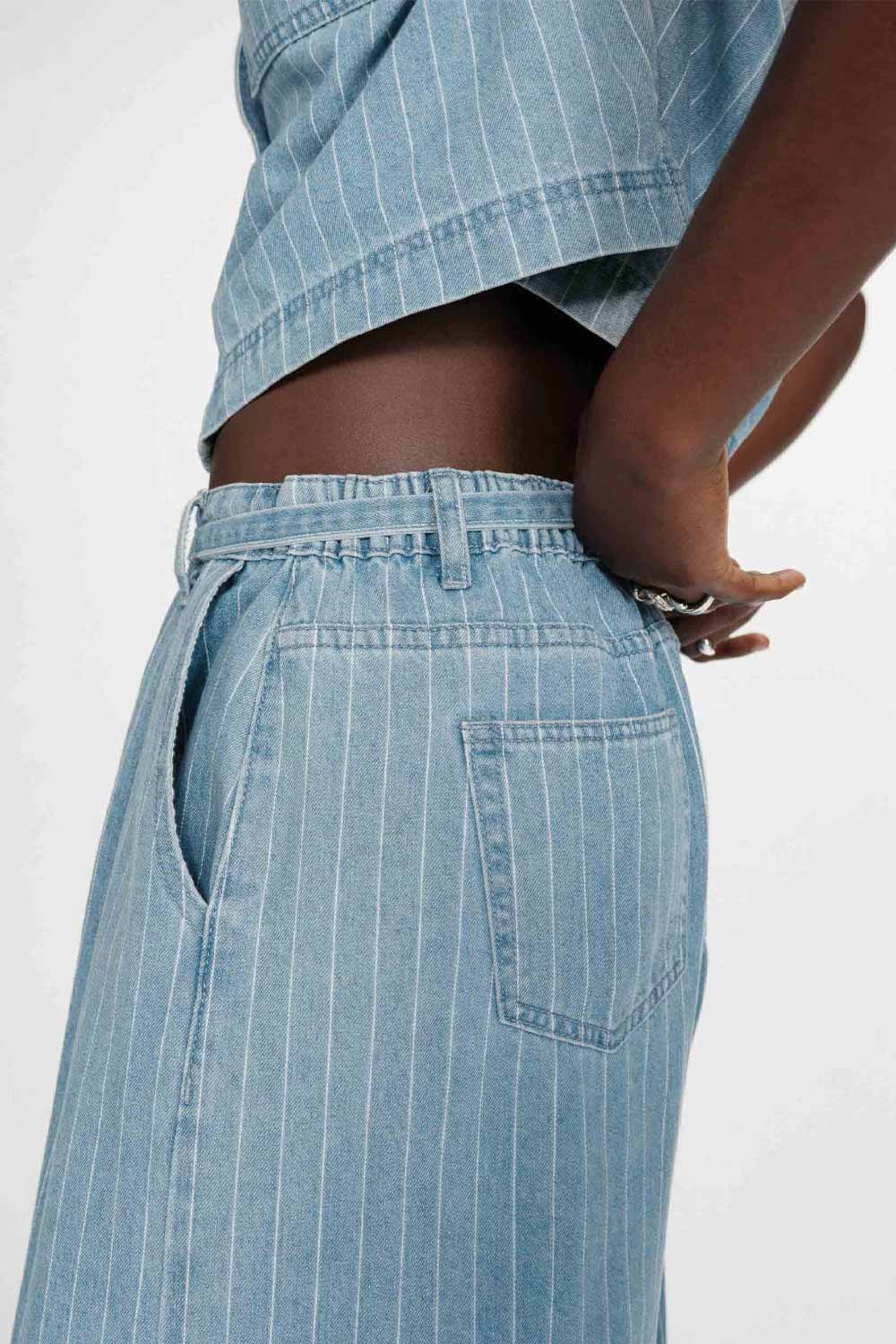 Jean baggy en toile de coton, couleur bleu à rayures blanches.