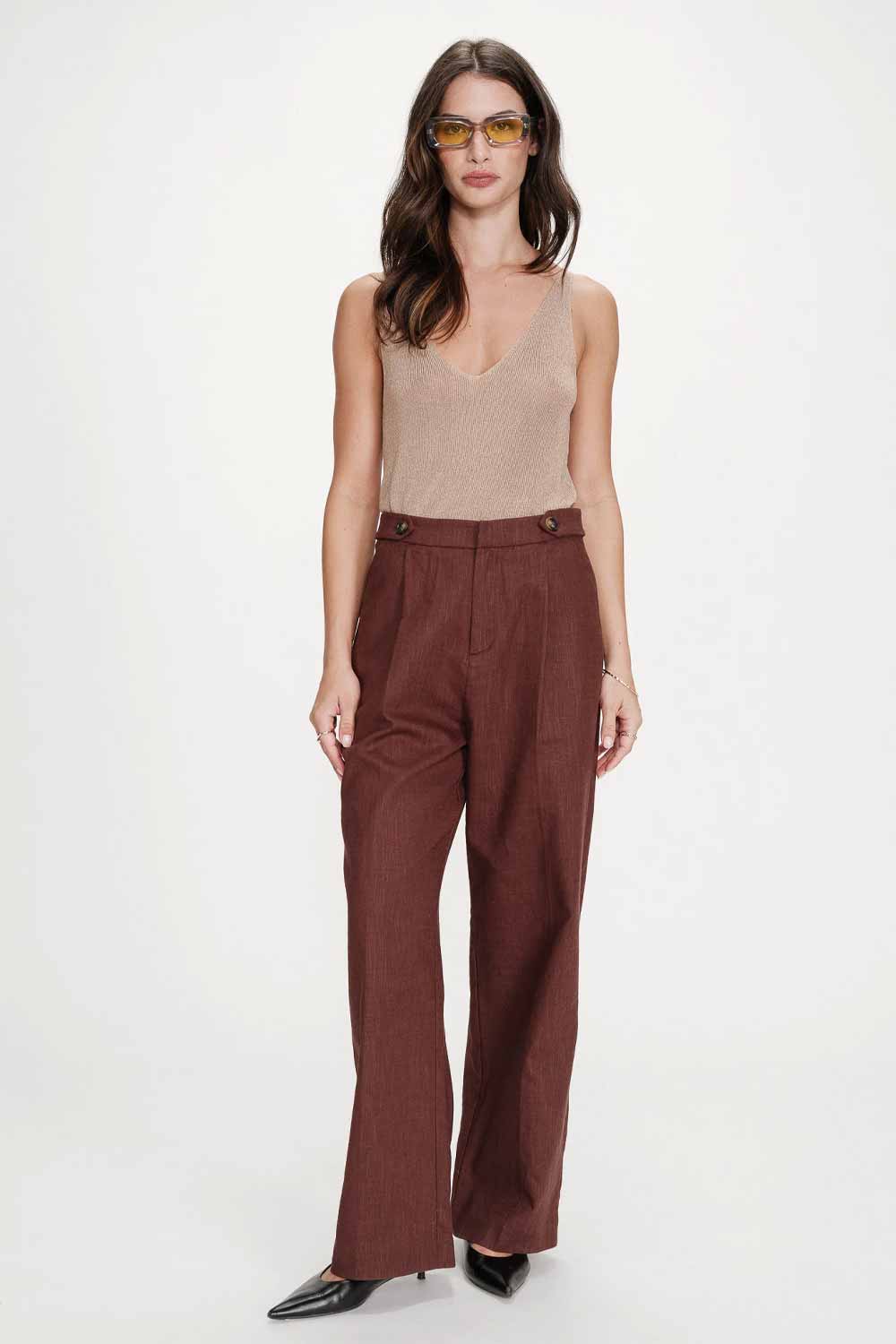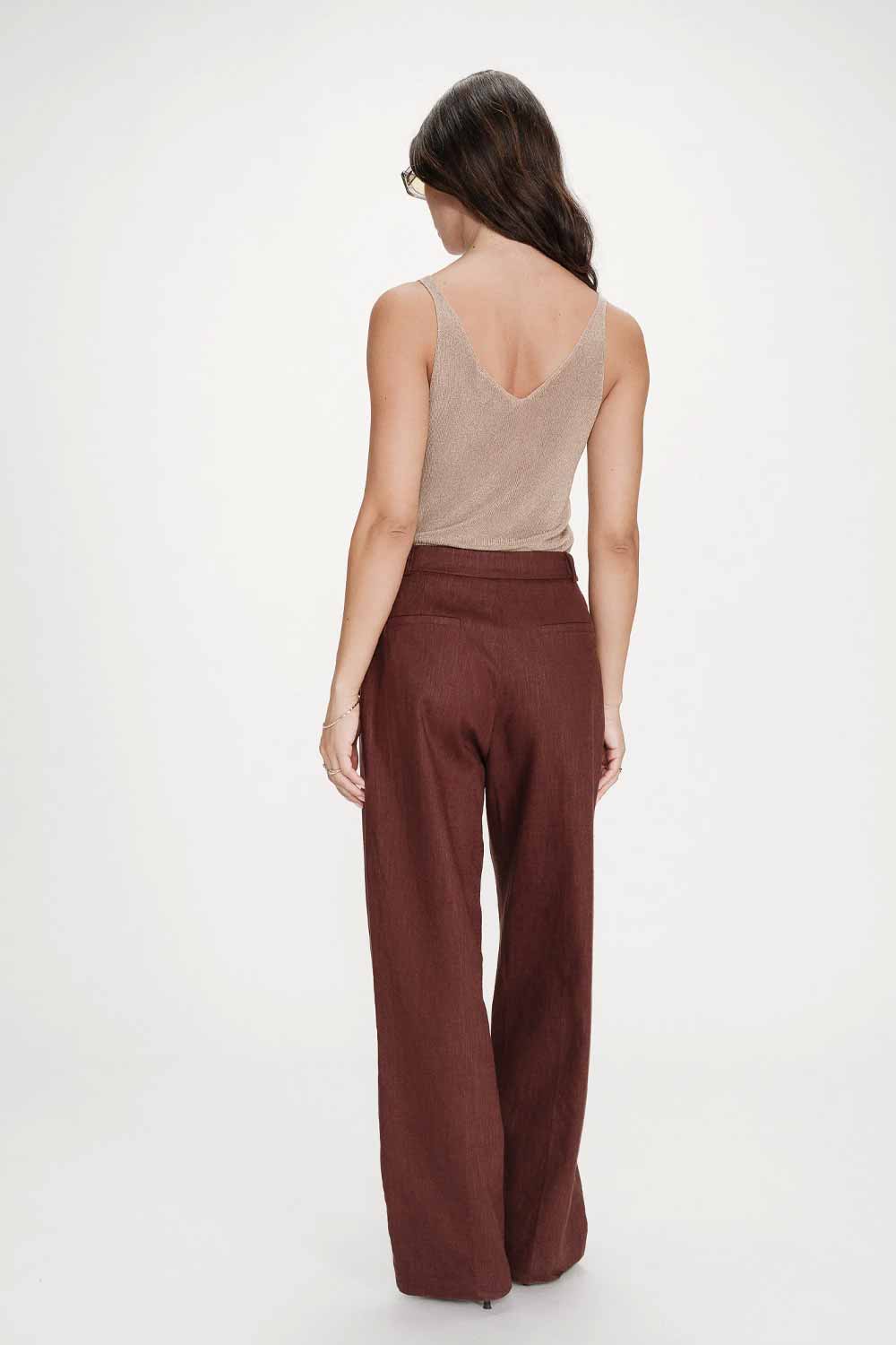 Pantalon de tailleur en lin, couleur chocolat.