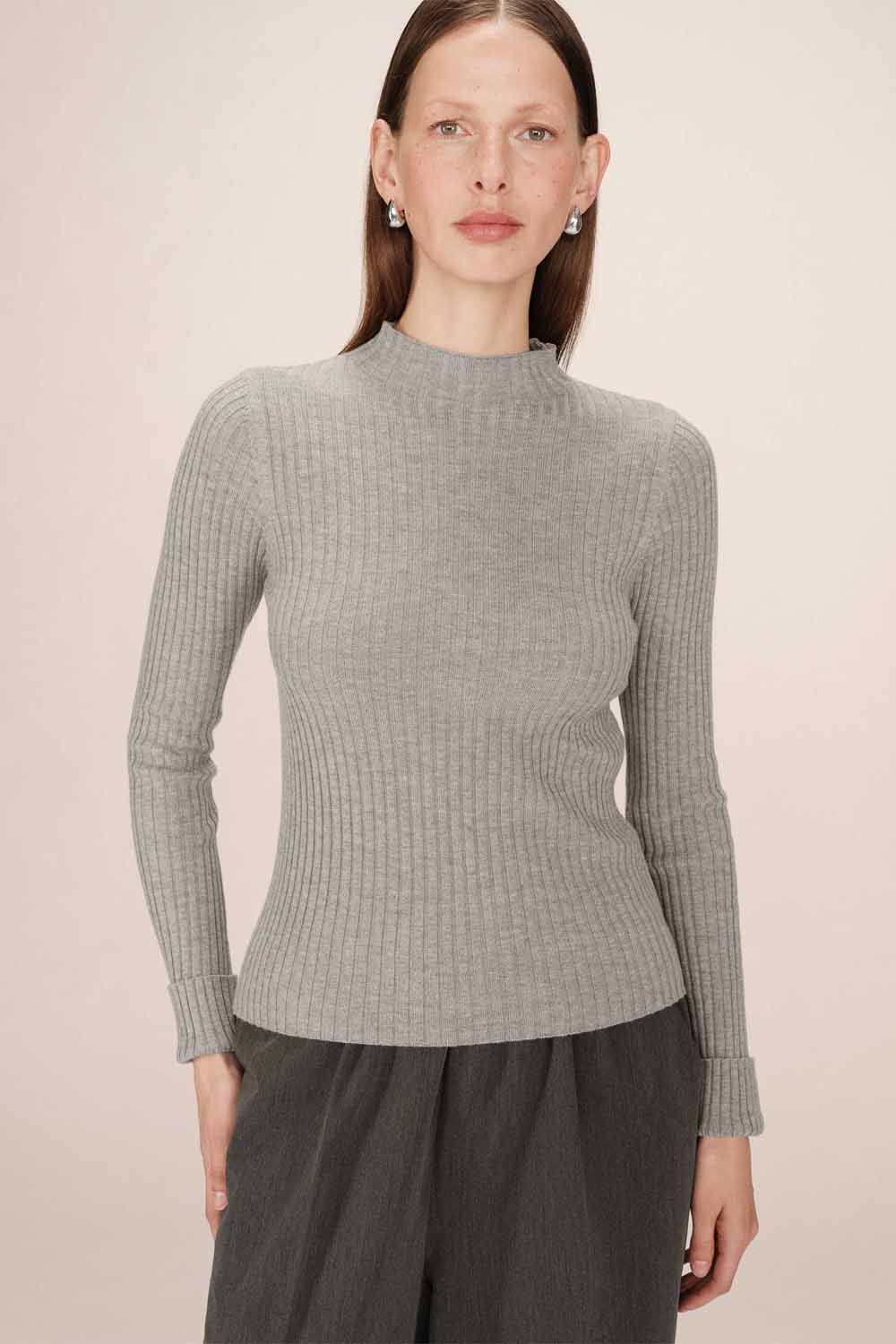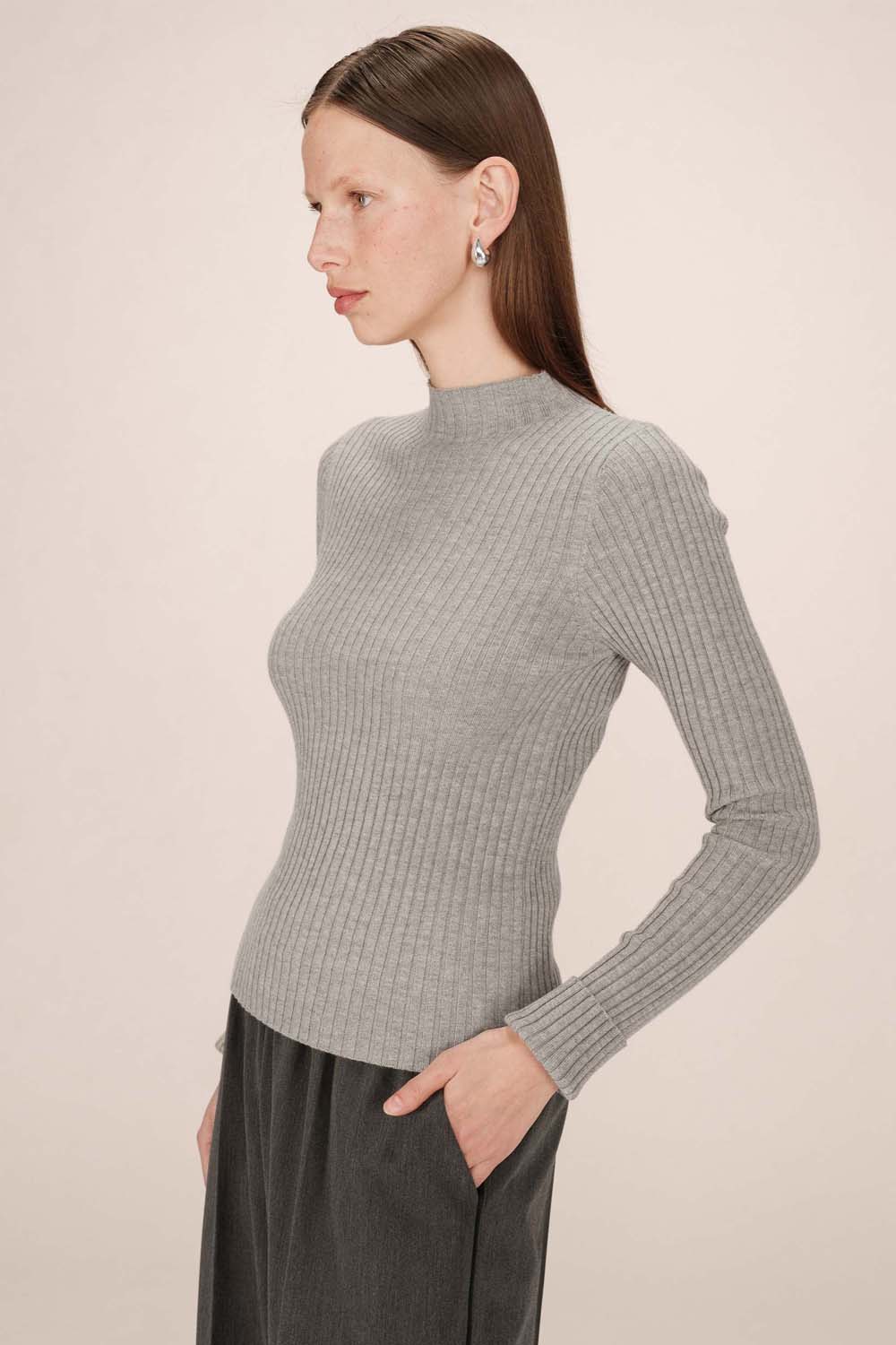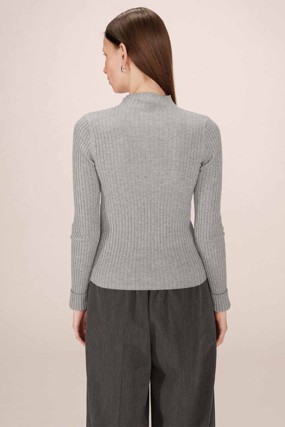 Pull en maille fine, tricotage en côtes, coupe ajustée, couleur gris.
