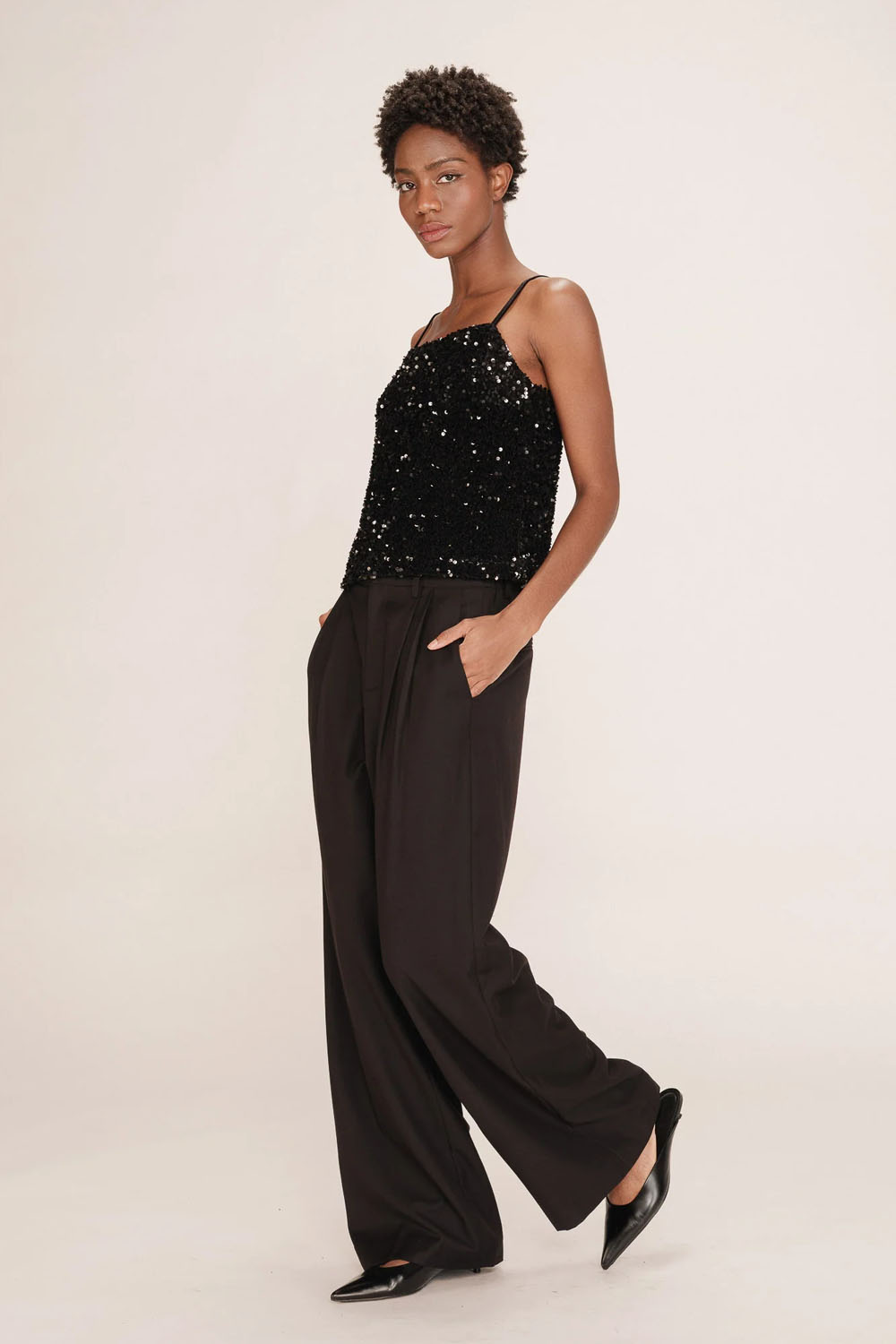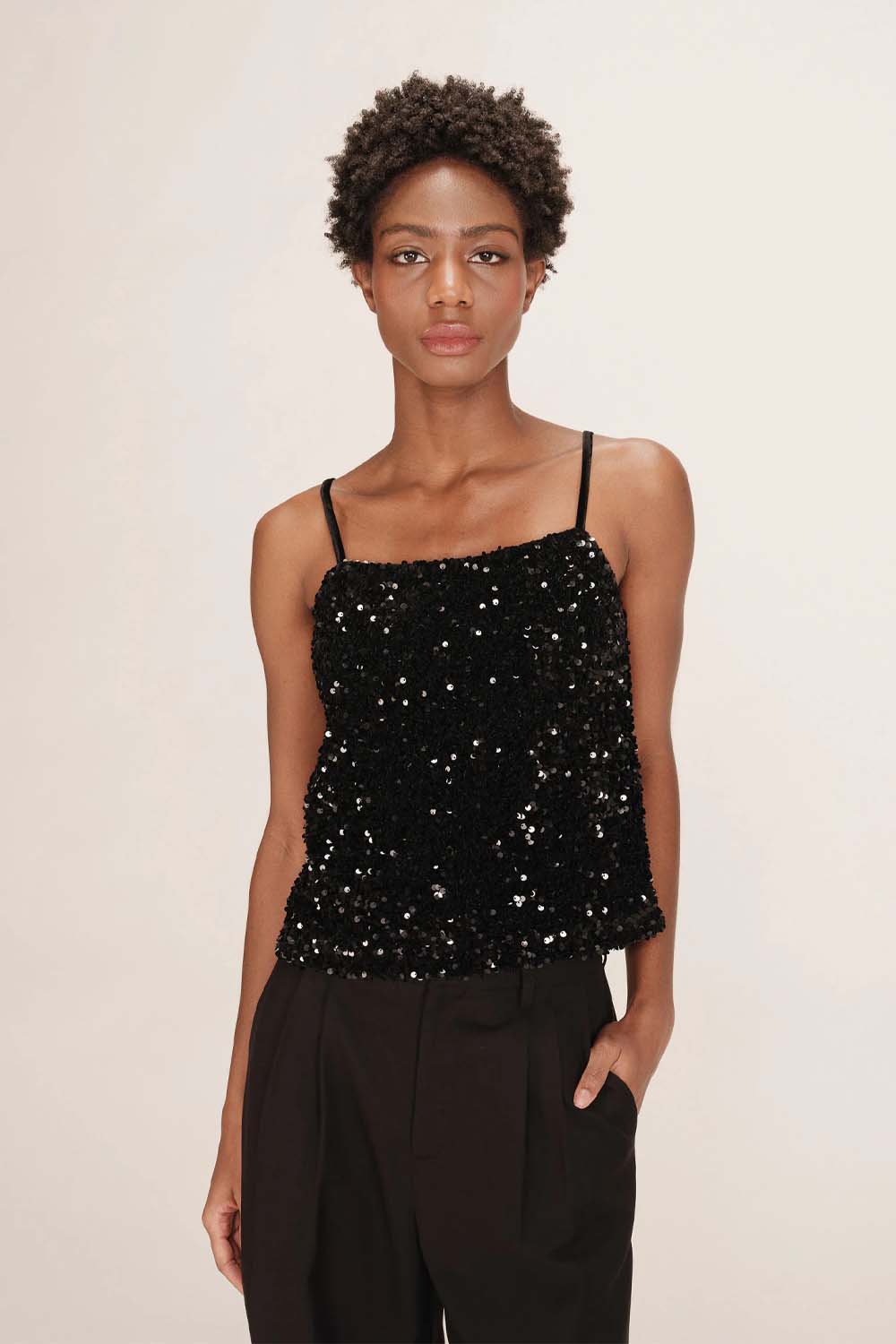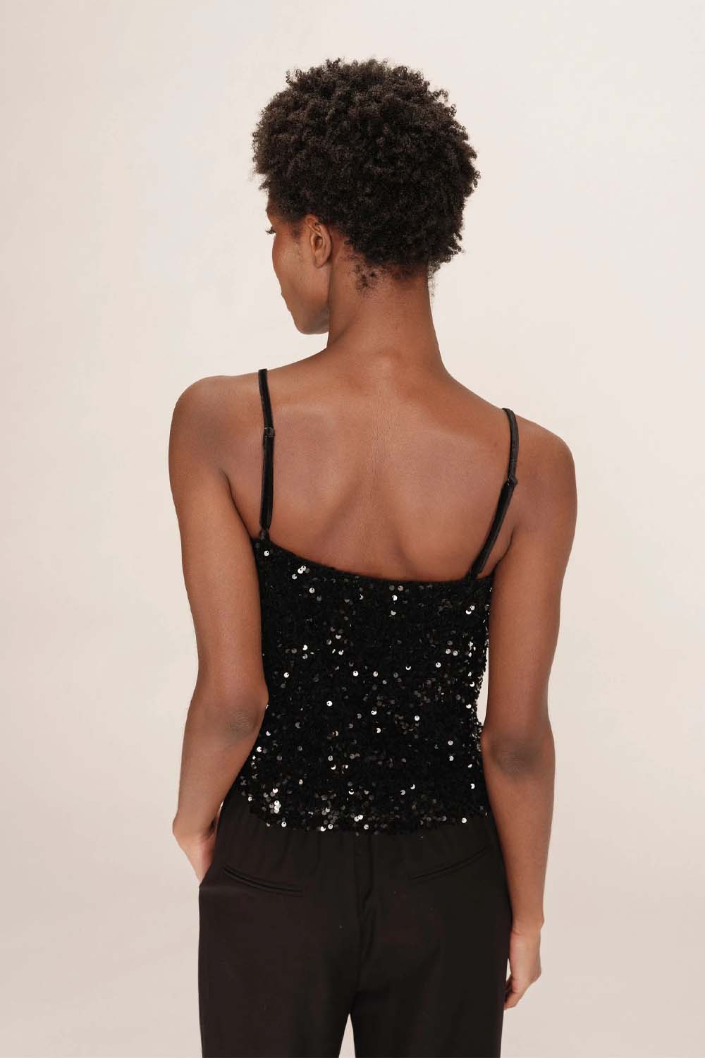 Top caraco en velours sequins, coupe droite, couleur noir.
